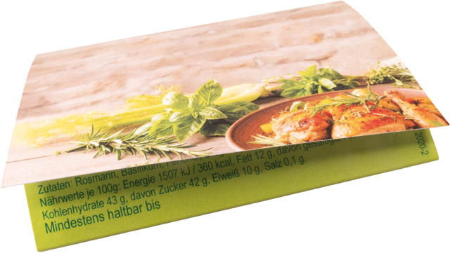 Beschreibung: Begeben Sie sich mit Ihren Kunden auf eine aromatische Reise durch die Provence. Unsere feine Geschmacksprobe Kräuter der Provence holt den Duft Frankreichs direkt in die Küche und weckt mediterrane Genussmomente. Setzen Sie Ihr Logo oder ein individuelles Kartendesign – ab 250 Stück – stilvoll in Szene und machen Sie dieses aromatische Giveaway zu einem geschmackvollen Werbeträger.